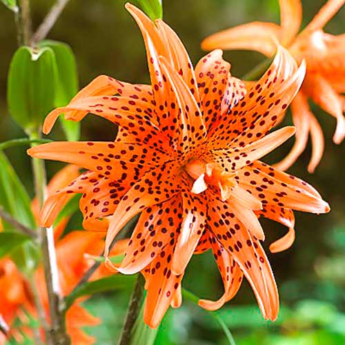 Это махровая свисающая лилия с насыщенно-оранжевым окрасом. Особый шарм цветкам придает коричневый крап. В высоту растение достигает 90 – 110 см. В одном соцветии собрано по 10 – 12 бутонов. Диаметр каждого цветка составляет 10 – 15 см. Набитие лепестков густое – по 24 – 36 штук. Период цветения длится с июля по сентябрь. Все это время лилия источает тонкий приятный аромат. Многолетник используют при создании цветников и клумб. Он отлично выглядит в окружении других цветочных и травянистых растений.
