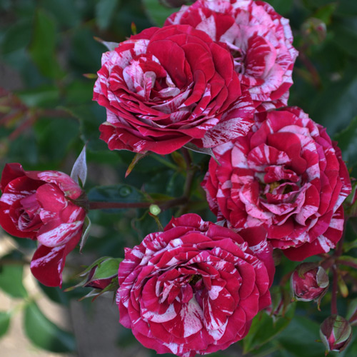 Куст раскидистый, высотой 50 – 60 см и диаметром 40 см. Листья на нем темно-зеленые, полуглянцевые. Побеги прочные и ошипленные. Цветы махровые, шириной 5 – 6 см. Лепестки очень пестрые, ярко-красные с розовыми полосками. Распускаются они из бокаловидного вишневого бутона. Аромат тонкий, едва уловимый. Длится цветение на протяжении всего сезона.