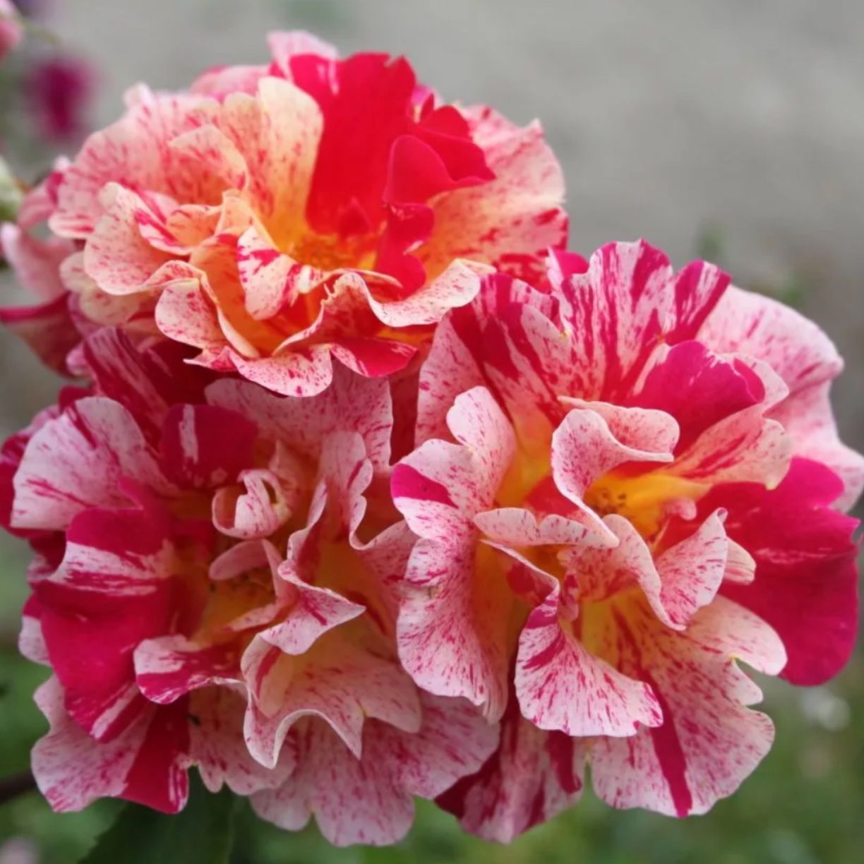 Кустарник вырастает крепким и мощным, высотой 60 – 80 см. Листва у него глянцевая, темно-зеленого цвета. Цветок элегантный, полумахровый, крупного размера. Лепестки насыщенно-красные, плавно переходящие в нежно розовый подтон. По всей поверхности они покрыты золотистыми штрихами. Период цветения начинается в июне и длится до октября-месяца. Раскрывшиеся бутоны источают приятный аромат черной смородины, гиацинта и малины.