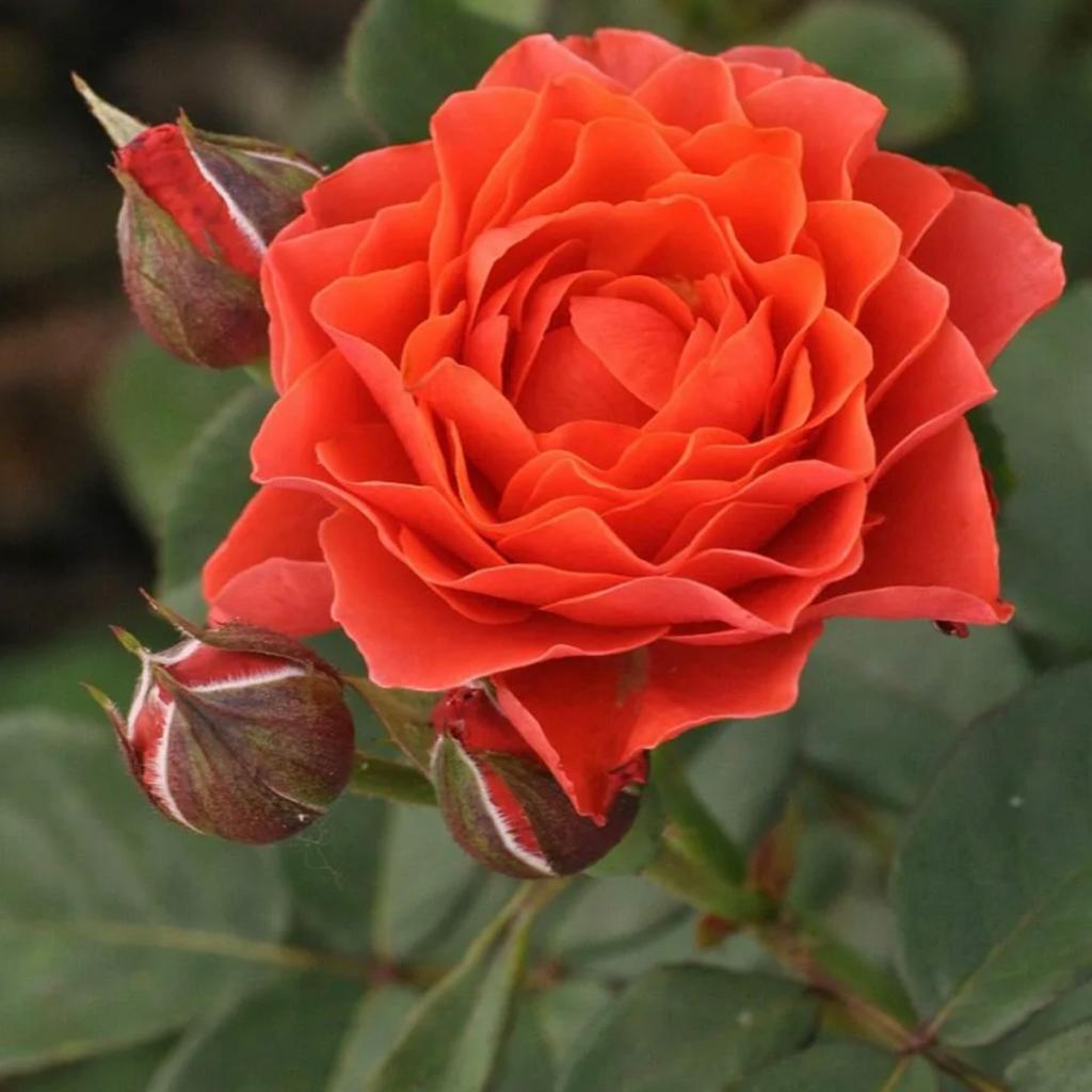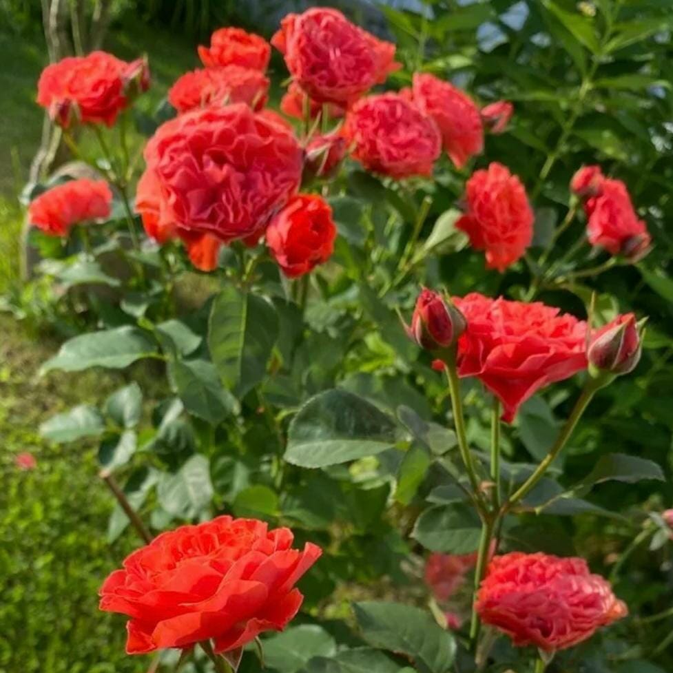 Кустарник вырастает крепким, густооблиственным, длиной 1 – 2 м. Цветы насыщенной красно-оранжевой окраски, шириной 8 – 15 см. На побегах они формируются поодиночке или собраны в соцветия-кисти по 4 – 5 штук. Листья глянцевые, плотные, темно-зеленого цвета. Цветение пышное и продолжительное, вплоть до глубокой осени. Роза источает приятный, слегка сладковатый аромат.