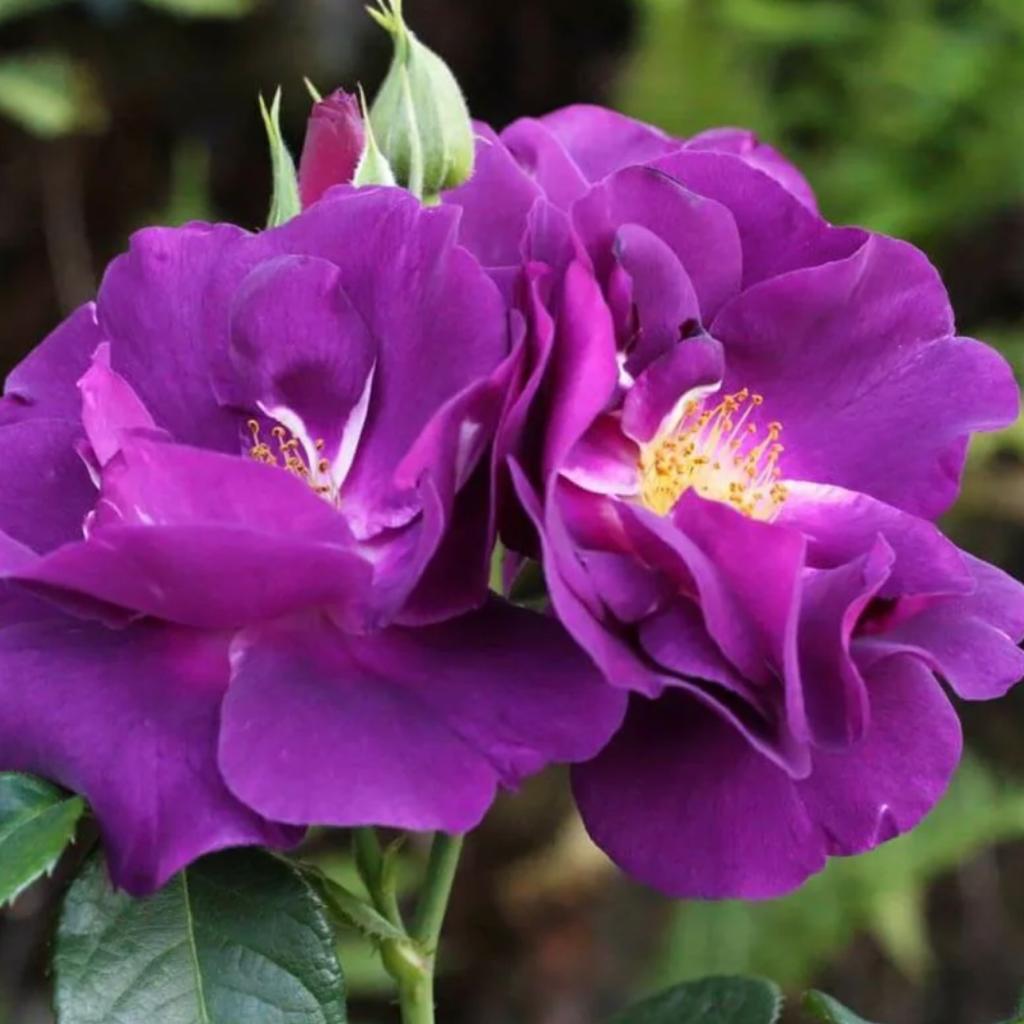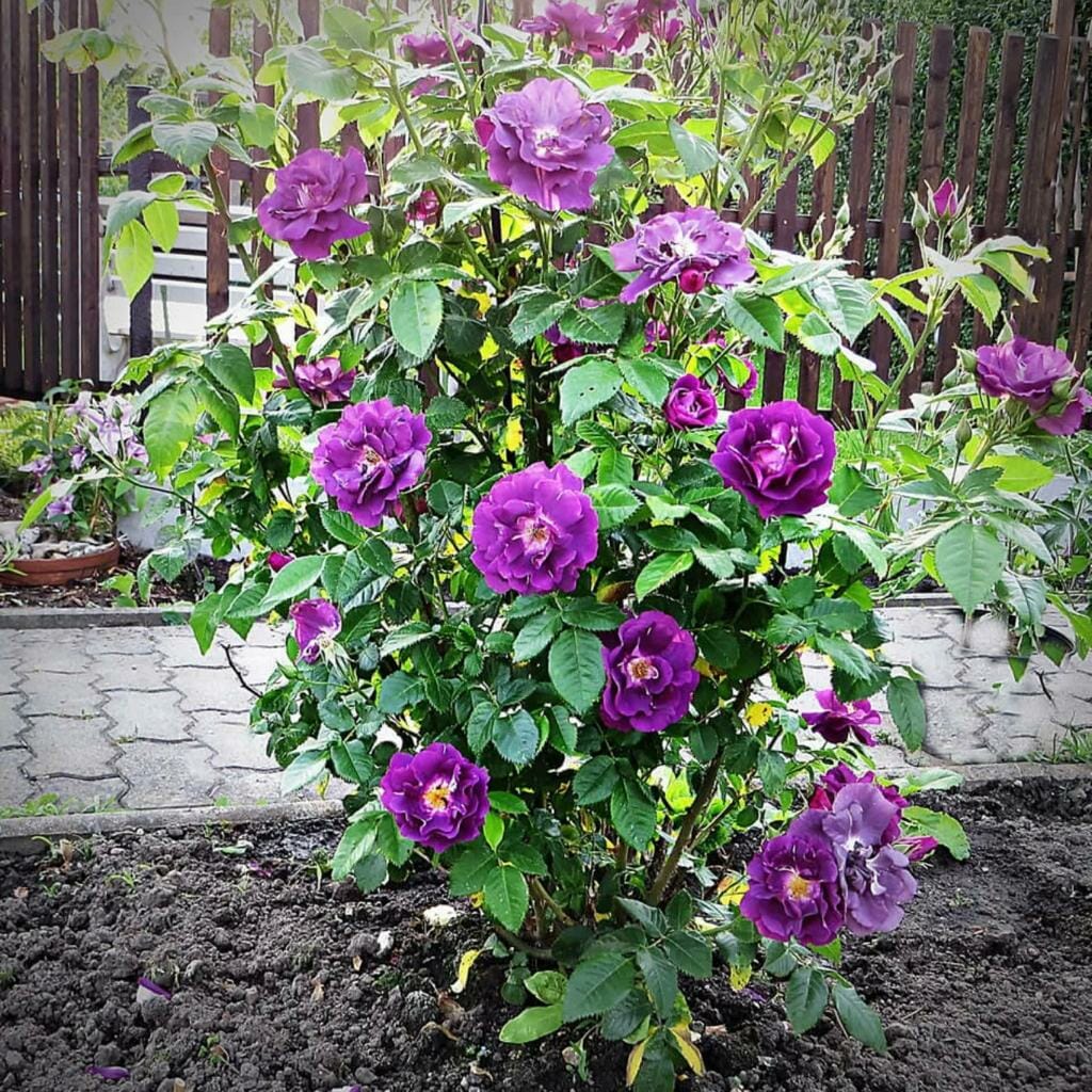 Кусты вырастают высотой 1,6 м и диаметром до 60 см. Побеги крепкие, прямые, с множеством колючих иголок. Листья ярко-зеленые, глянцевые, среднего размера. Цветки полумахровые (состоят из 20 лепестков), шириной до 5 см. Они собраны в рыхлые кистевидные соцветия (по 3 – 7 шт.) и равномерно распределены по всему кустарнику. Форма сначала коническая, а по мере роспуска становится плоскочашевидной. Цвет лепестков пурпурно-фиолетовый. Цветение пышное и обильное, начинающееся с июня-месяца. Аромат тонкий и ненавязчивый, с гвоздичными нотками.