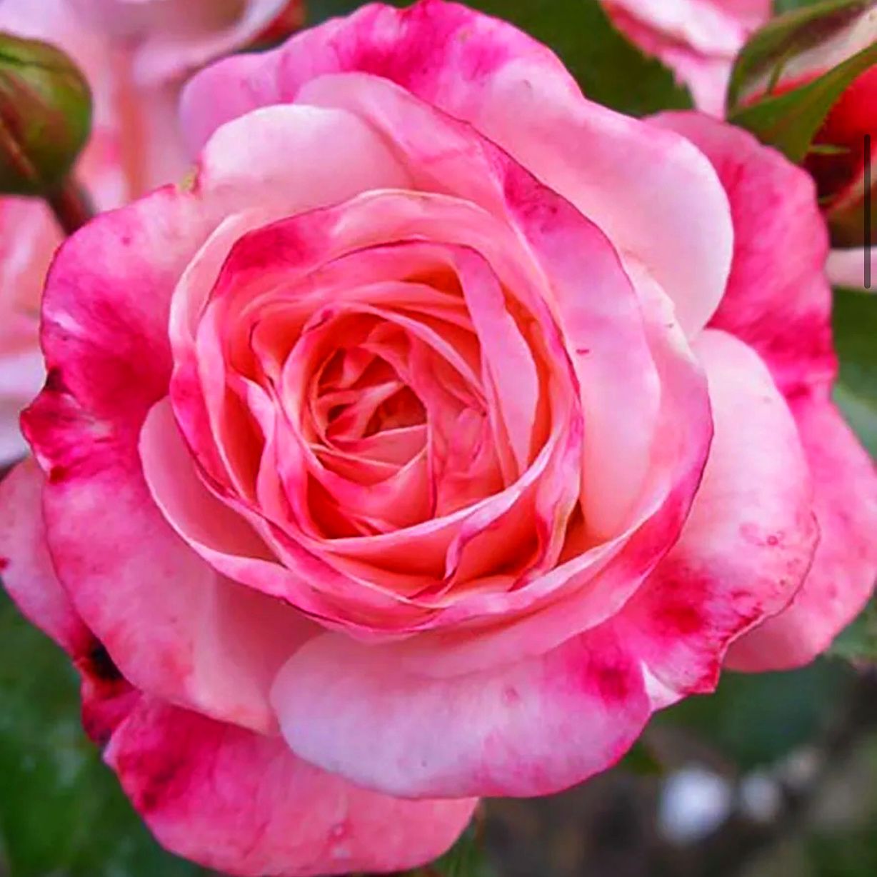 Это крепкий и красивый шраб, привлекающий внимание оригинальной «росписью» цветков. Раскрывшиеся бутоны не слишком большие (шириной 6 – 7 см), чашевидной формы, махровые (состоят из 30 – 35 лепестков). Лепестки белые, с контрастной алой окантовкой по краям. Цветы собраны в аккуратные соцветия, источающие тонкий и ненавязчивый аромат. Цветение длительное и пышное, продолжающееся в течение всего сезона. Побеги прямостоячие, длиной 1,2 м. Диаметр куста равен 80 см.